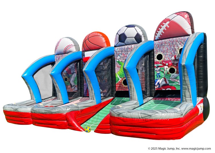 The Sports Shootout Inflatable Game is a strong attraction for sporting events, family entertainment centers, school functions, backyard parties, indoor play centers, and community festivals. It can be used as a standalone game or integrated into athletic obstacle course competitions, making it a versatile addition to any rental inventory.